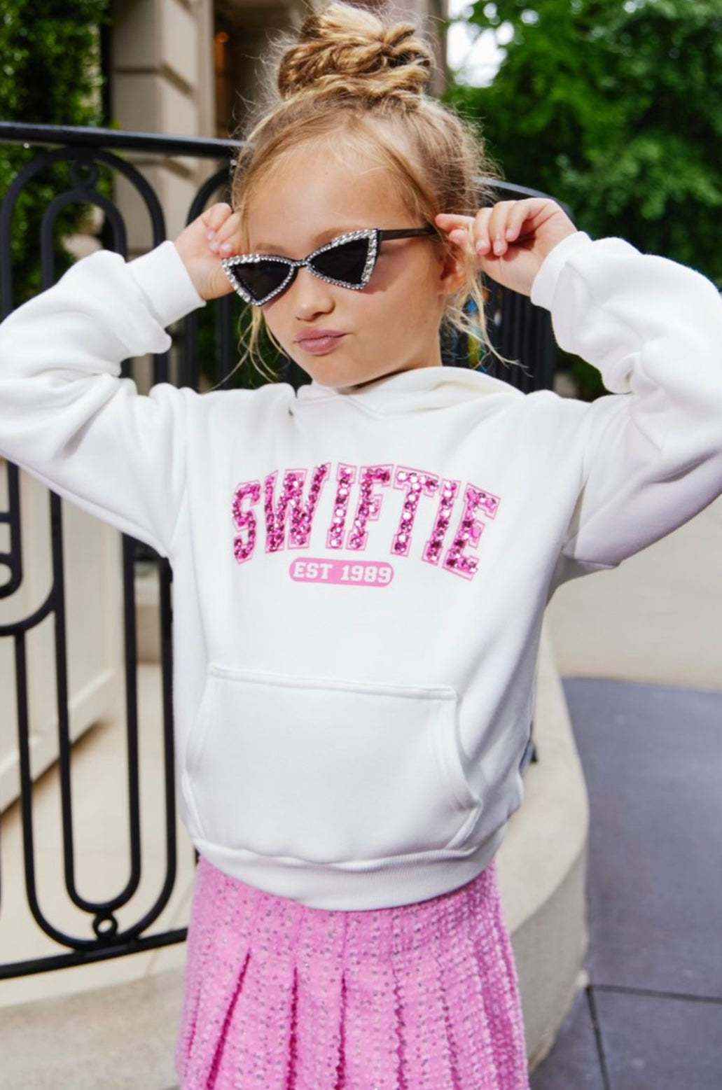 - Show your Swiftie pride with this chic hoodie, featuring bold pink sequined "Swiftie" lettering and "EST 1989" detail.